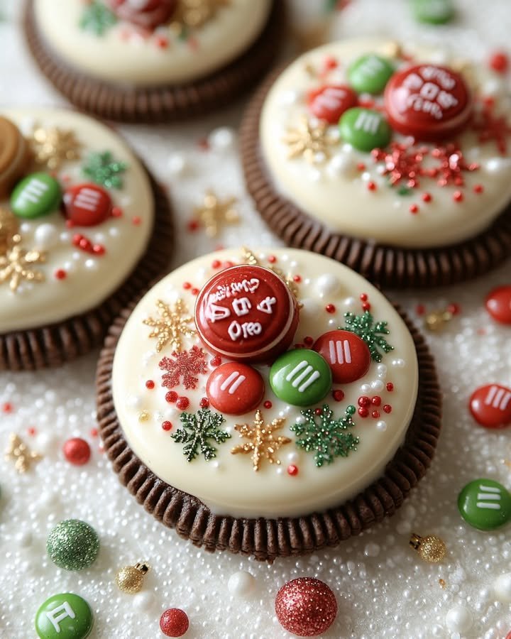 Christmas Ornament Oreo Treats Ingredients: 1 package 15.25 oz Oreo cookies 2 cups white chocolate chips or candy melts Mini Reeses cups halved Red and green mini M&Ms Festive sprinkles …