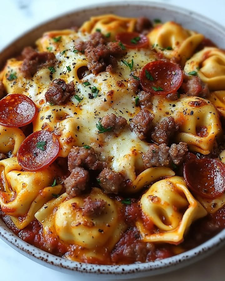 Meat Lovers Pizza Tortellini Hearty Meat Lovers Pizza Tortellini Ingredients: 12 ounces tortellini pasta pound Italian ground sausage medium yellow onion, diced 1 pound ground beef 1 tablespoon olive oil …