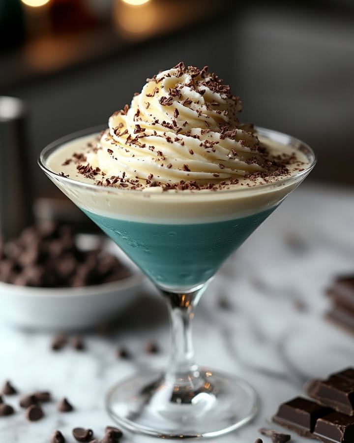 Blue Mint Chocolate Chip Martini, Ingredients: 1 oz Creme de Menthe choose a clear version to avoid green color 1 oz Blue Curaçao for the blue color 1 oz Creme …