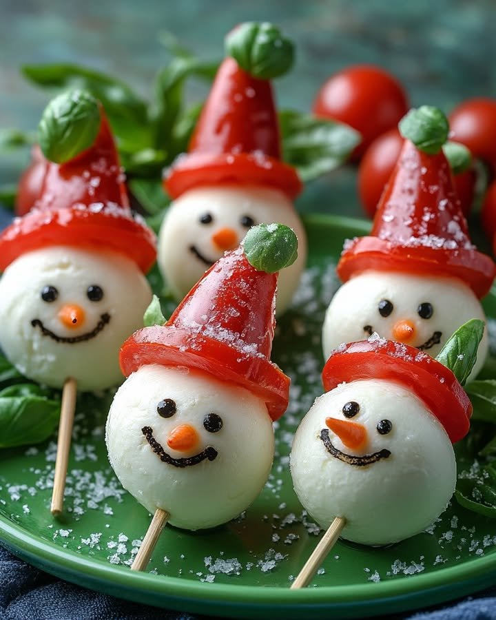Snowman Hat Caprese Skewers Ingredients: Cherry tomatoes for the snowman hats Mini mozzarella balls for the snowman heads Fresh basil leaves Toothpicks or small skewers Balsamic glaze for decoration Instructions: …