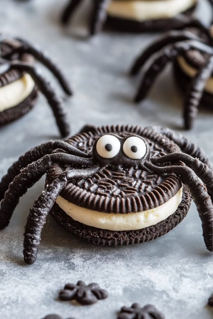 Fun Oreo Spider Cookies Ingredients: 24 Oreo cookies 1 can 16 oz vanilla frosting 5 oz chocolate Pocky sticks or pretzel sticks, halved 1 oz candy eyes or M&Ms Directions: …