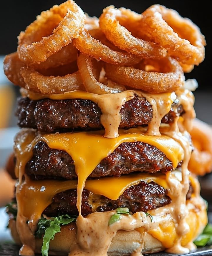 Ultimate Cheeseburger Tower with Onion Rings Recipe ï§€ Ingredients: 500g ground beef for patties Salt and pepper to taste 4 slices of cheddar cheese 1/2 cup cheese sauce 4 onion …