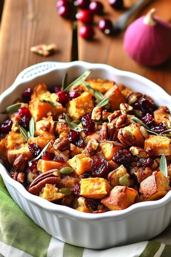 Sweet Potato Cranberry Pecan Stuffing Ingredients: 1 loaf French bread about 12 cups, cubed 2 medium sweet potatoes, peeled and diced 1 tbsp olive oil 1/2 cup butter 1 large …