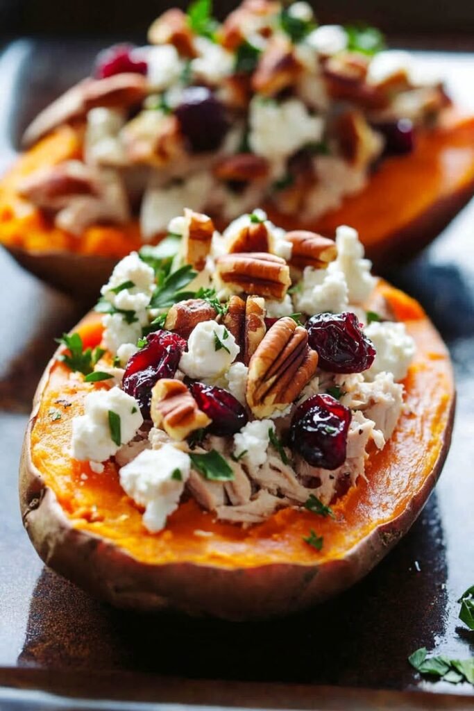 Turkey, Cranberry & Goat Cheese Stuffed Sweet Potatoes Ingredients: 4 medium sweet potatoes 1 1/2 cups cooked turkey, shredded or chopped 1/3 cup dried cranberries 2 ounces goat cheese, crumbled …
