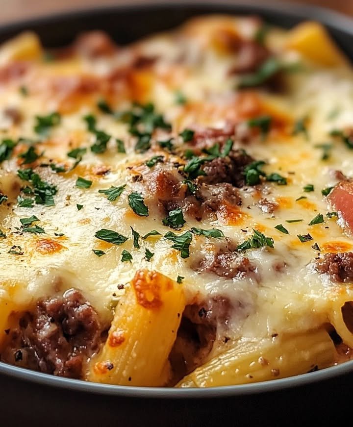 Baked Pasta with Beef and Cheese Recipe Enjoy #sandwichlover #comfortfood #meltygoodness #pattymelt #classicdiner #homemadeburger #sizzlinggrill #swisscheese #secretrecipe #cheesy #ryebread #burgernight #crispybread #foodie #dinnertime