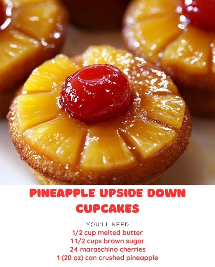 Who Wants a Pineapple Party in a Cupcake? Ingredients: – 1/2 cup melted butter – 1 1/2 cups brown sugar – 24 maraschino cherries – 1 20 oz can crushed …