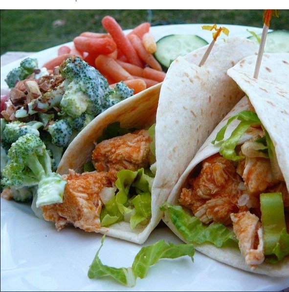 Buffalo Chicken Wraps Ingredients: 2 cups cooked chicken, shredded1/4 cup buffalo sauce1/4 cup ranch or blue cheese dressing1 cup shredded lettuce1/2 cup diced tomatoes1/2 cup shredded cheddar cheese4 large flour …