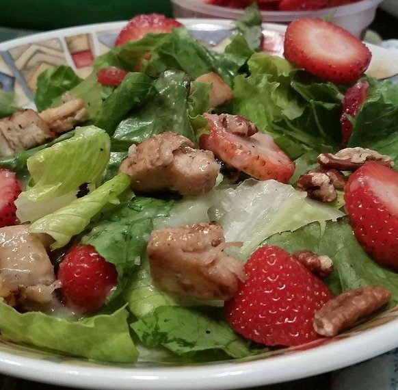 Grilled Chicken Salad with Seasonal Fruit 綾 Ingredients: 2 grilled chicken breasts, sliced6 cups mixed greens1/2 cup strawberries, sliced1/2 cup orange segments1/4 cup apple, sliced thin1/4 cup blueberries1/4 cup goat …