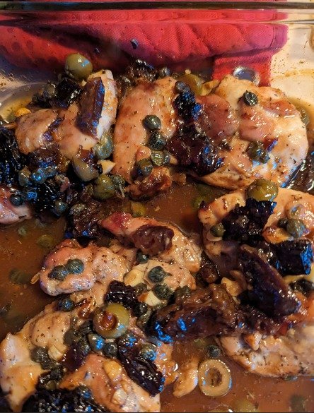 Chicken Marbella Ingredients: 4 bone-in, skinless chicken thighs 1/2 cup pitted green olives, chopped 1/4 cup capers 1/2 cup prunes, chopped 1/4 cup red wine vinegar 1/4 cup olive oil …