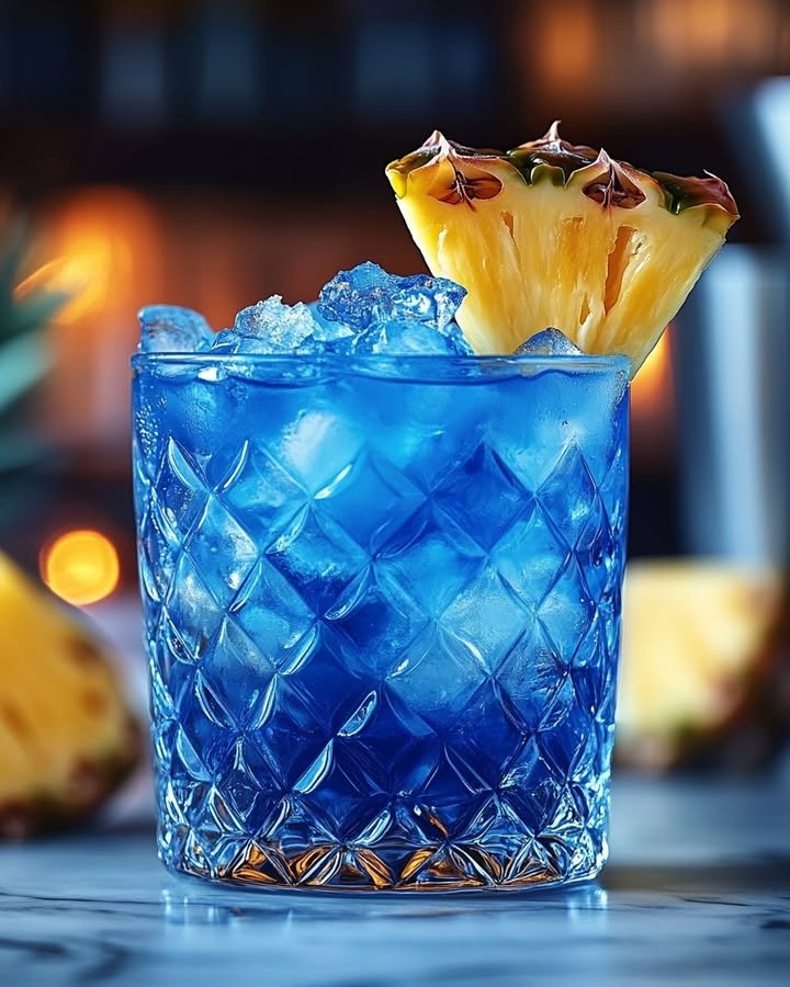 Blue Inferno A refreshing and fiery cocktail with a mix of cinnamon, blue curaçao, coconut rum, and pineapple juice.