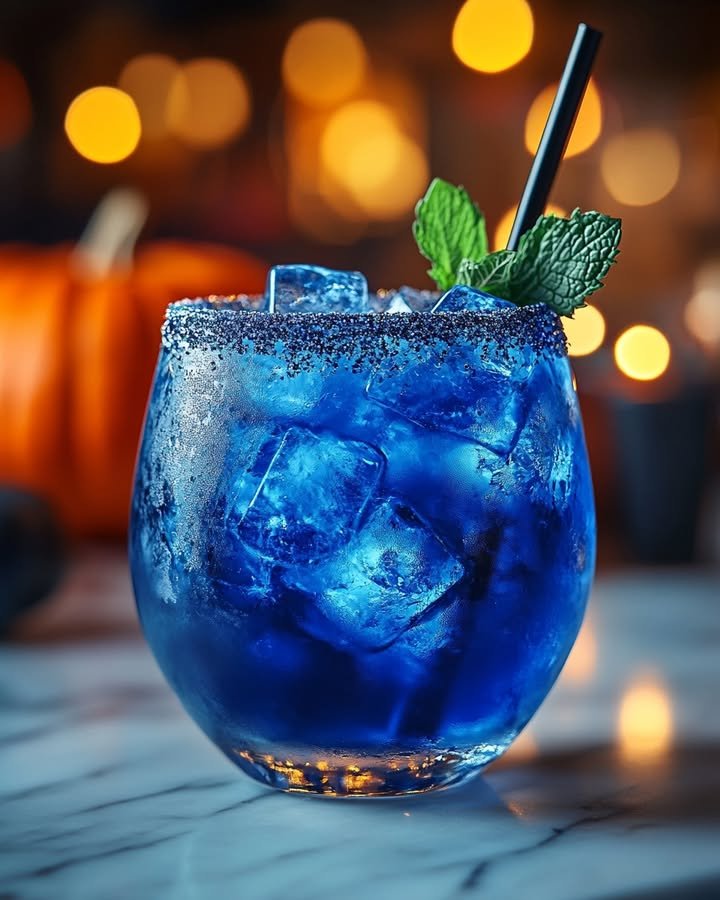 In a cocktail shaker filled with ice, combine raspberry vodka, vodka, blue curaçao, peppermint syrup, lime juice, and silver cake shimmer.