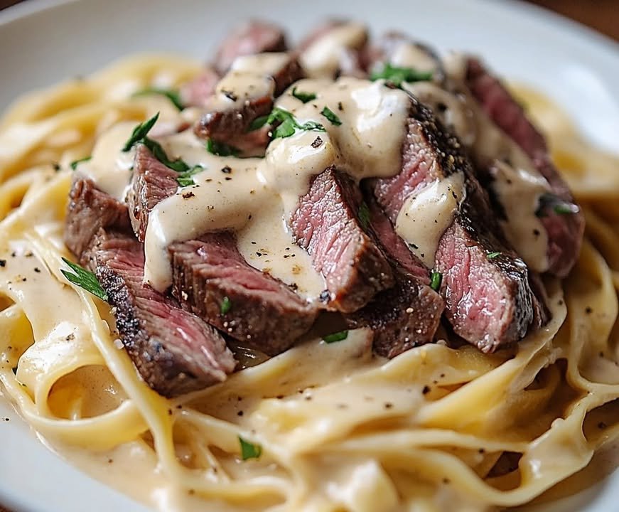 Perfectly seared steak slices served over creamy fettuccine pastaa decadent and hearty meal thats pure comfort on a plate!