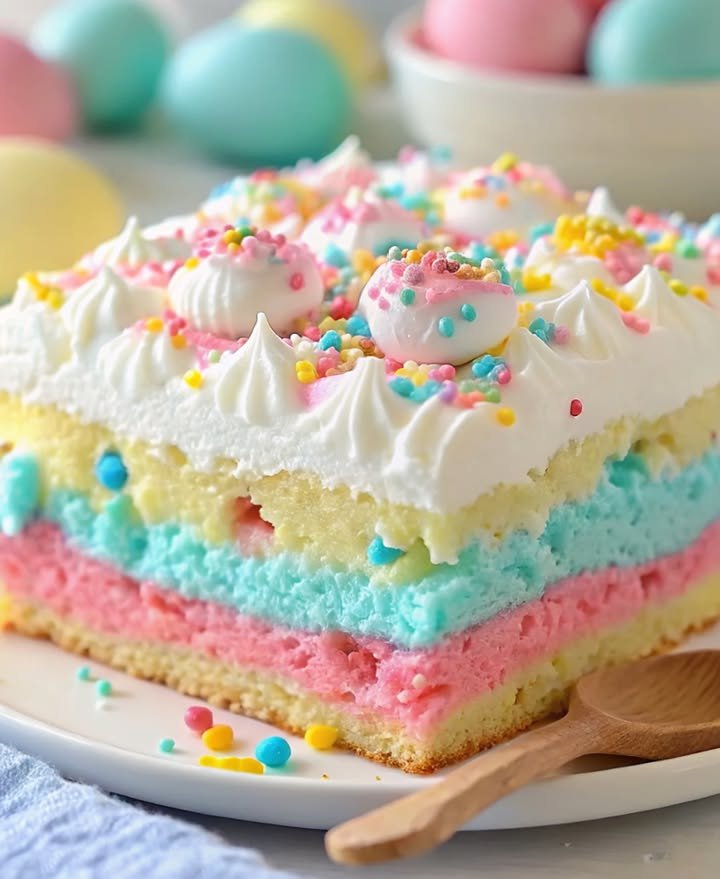 Top with a thick layer of whipped topping and pastel sprinkles.