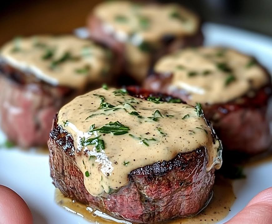 This elegant filet mignon is perfectly seared and topped with a rich, creamy Dijon herb sauce. Ideal for a special occasion or an indulgent dinner, this dish will impress your guests with its flavor and presentation.