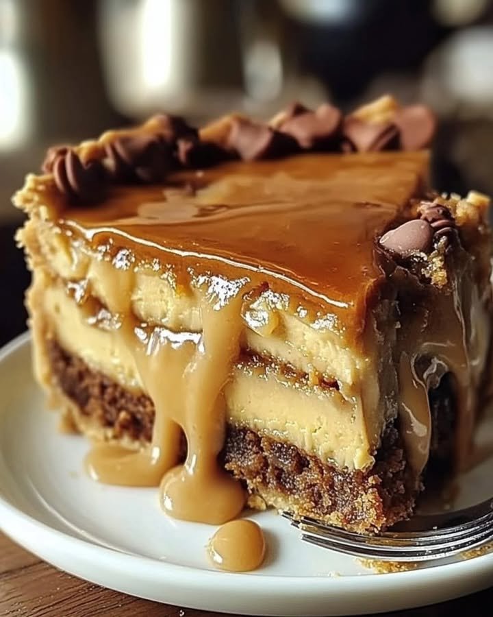 Slice the cake and enjoy the gooey, caramel-laden layers with a cup of coffee for a perfect indulgent treat!