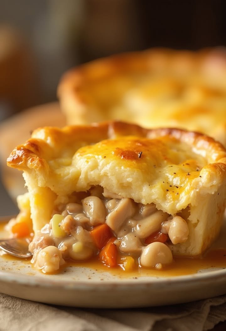 Prepare the Filling: In a large pan, melt the butter over medium heat. Add onions, carrots, celery, and cook until softened. Stir in the flour and cook for 1-2 minutes. Slowly whisk in chicken broth and heavy cream, cooking until the sauce thickens. Add peas, shredded chicken, thyme, rosemary, salt, and pepper. Stir to combine, then remove from heat.