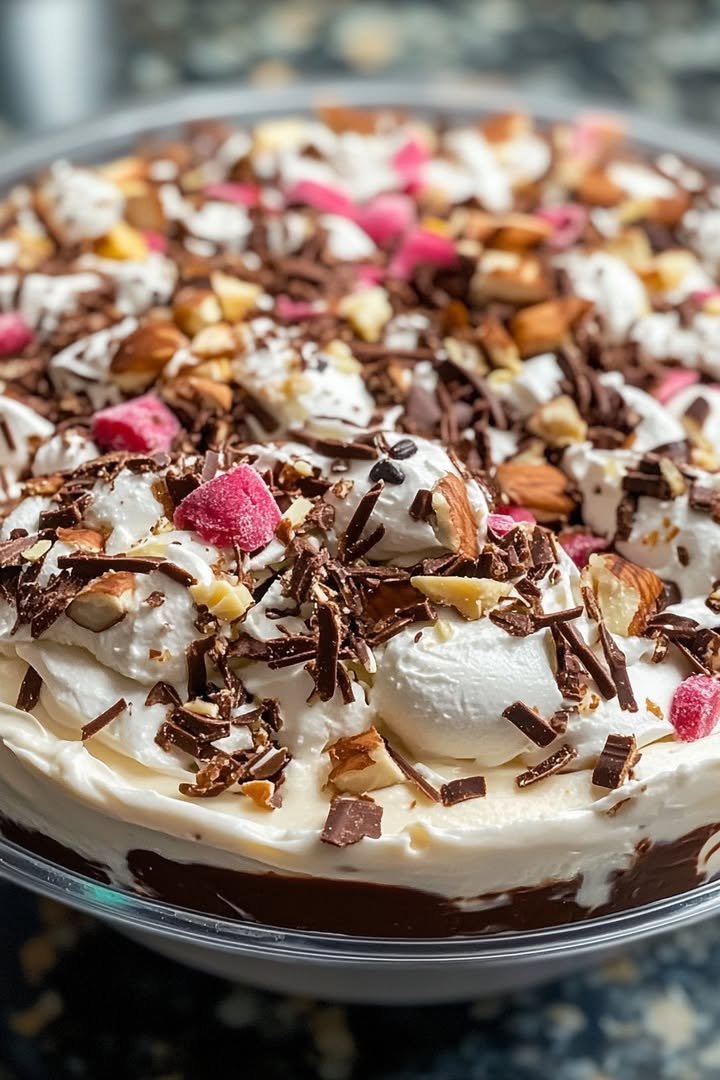 Prepare the Crust: In a mixing bowl, combine the chocolate cookie crumbs and melted butter. Press the mixture firmly into the bottom of a 9×13-inch baking dish. Refrigerate to set while preparing the other layers.