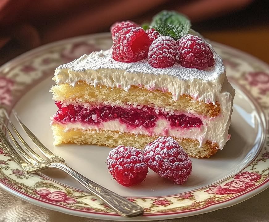 A luscious and light dessert with layers of fluffy cake, whipped cream, and a tart raspberry filling perfect for any occasion!