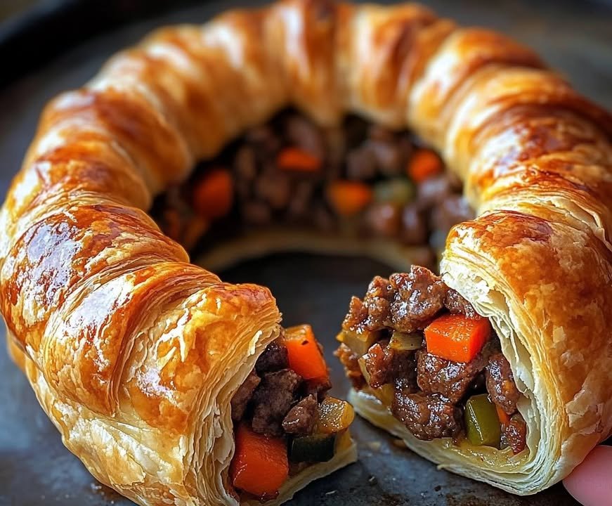 This golden-brown puff pastry ring is filled with tender beef, bell peppers, and melty cheese, creating a deliciously satisfying dish thats perfect for sharing at gatherings or as a hearty dinner.