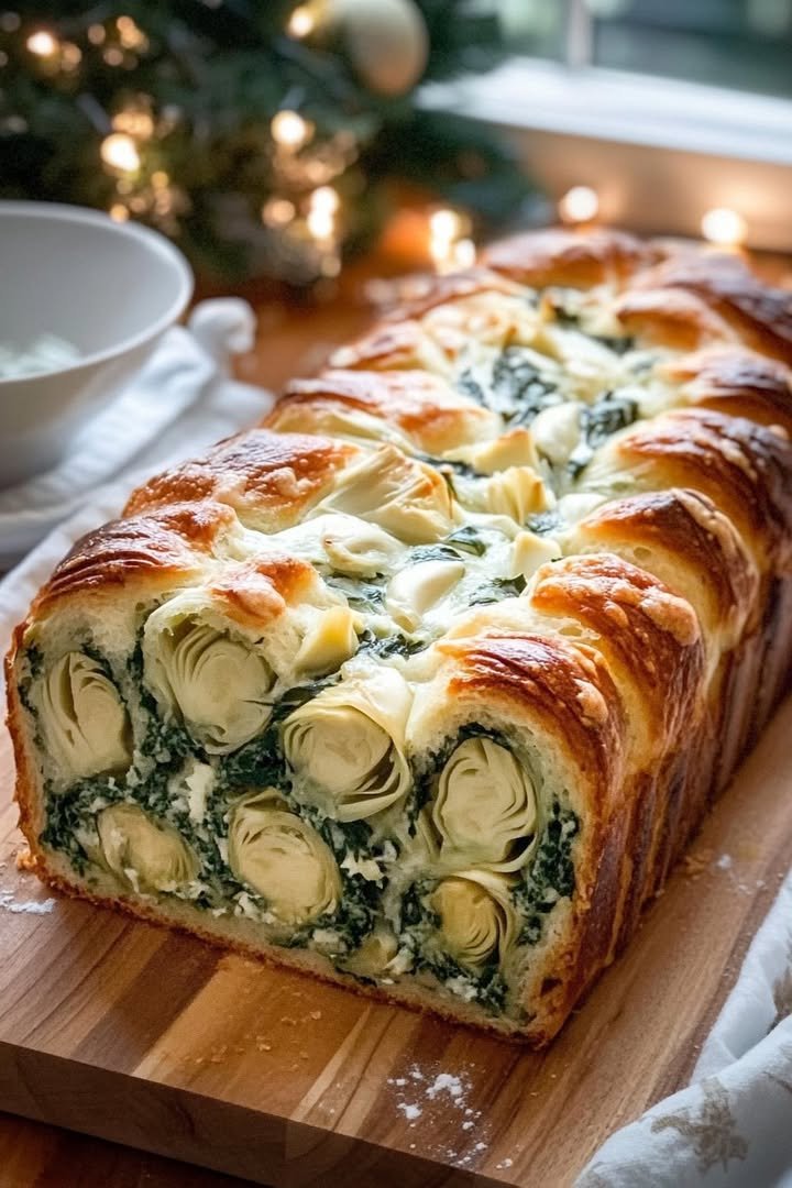 This festive pull-apart bread, filled with creamy spinach artichoke dip and melted cheese, is perfect for holiday gatherings!