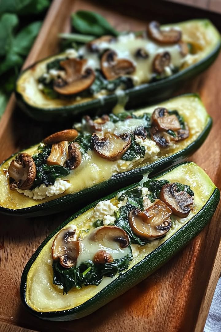 A deliciously cheesy, veggie-packed dish thats perfect as a side or light main course. Enjoy these zucchini boats filled with spinach, mushrooms, and creamy ricotta!