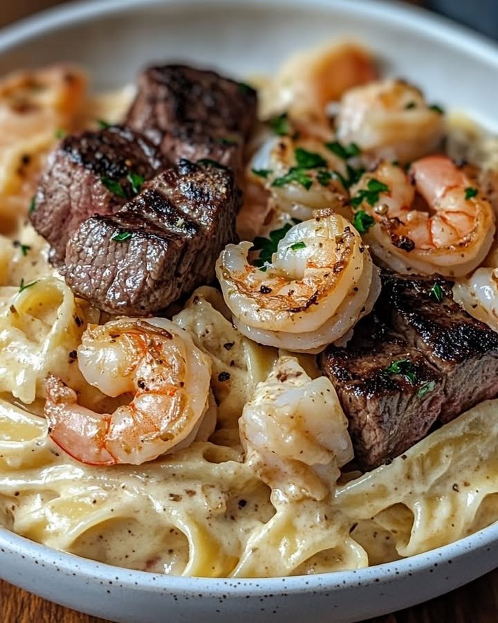 #SteakAndShrimp #AlfredoPasta #FoodieFavorites #GourmetAtHome