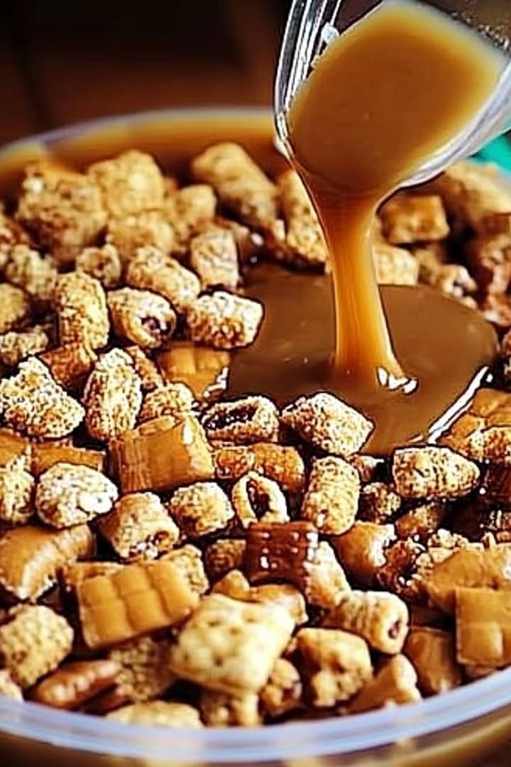 Pour the hot praline mixture over the cereal and pretzel blend. Toss gently until everything is evenly coated.